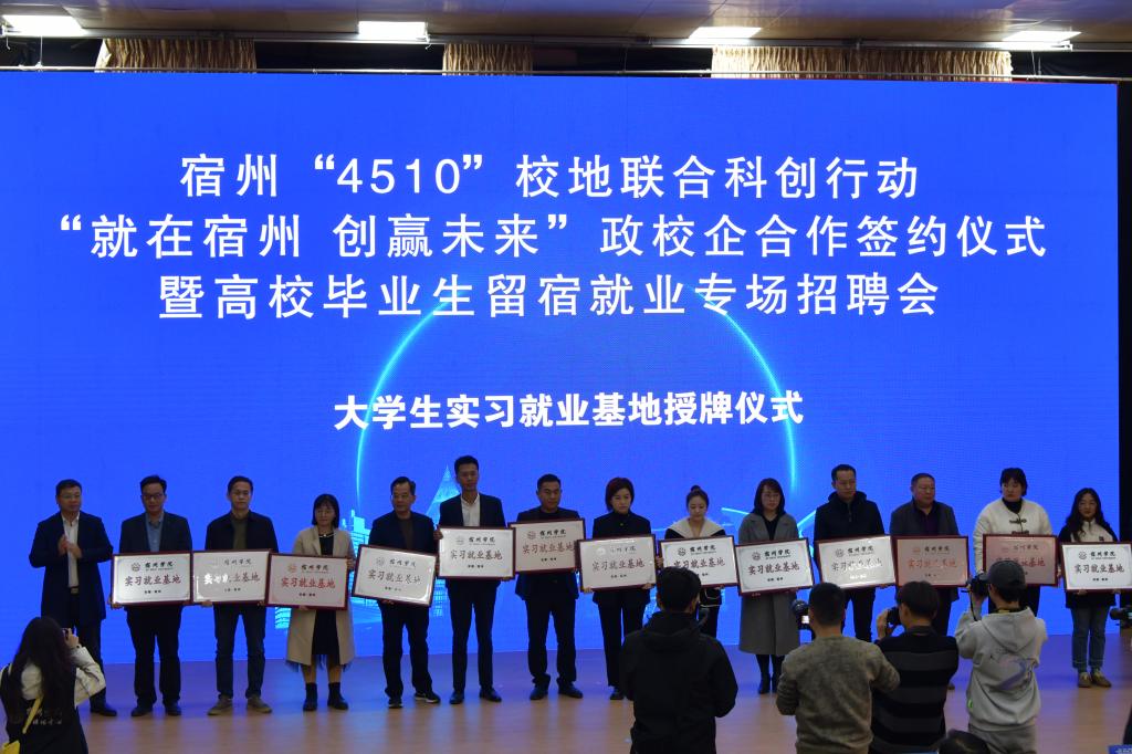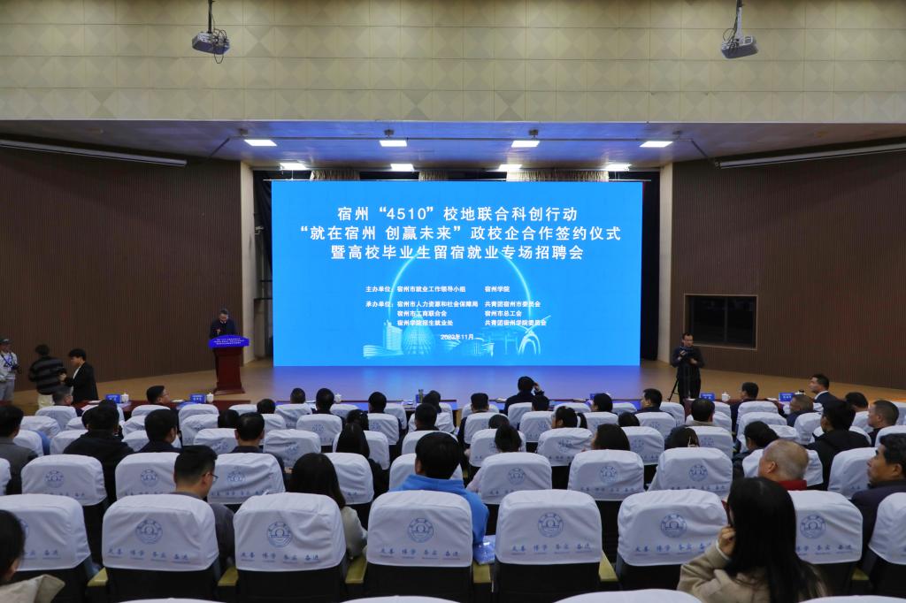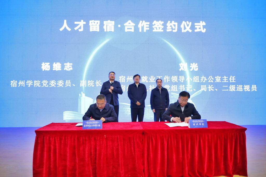 为贯彻落实党中央、国务院关于做好高校毕业生就业工作的决策部署,落实省委、省政府有关工作要求,拓宽高校毕业生就业渠道,11月20日下午,宿州“4510”校地联合科创行动“就在宿州 创赢未来”政校企合作签约仪式暨高校毕业生留宿就业专场招聘nbl联赛是什么意思在宿州龙8平台教育园区校区举行。本次活动由宿州市就业工作领导小组、宿州龙8平台联合主办,宿州市人力资源和社nbl联赛是什么意思保障局、共青团宿州市委员nbl联赛是什么意思、宿州市工商联合nbl联赛是什么意思、宿州市总工nbl联赛是什么意思、宿州龙8平台招生就业处、共青团宿州龙8平台委员nbl联赛是什么意思共同承办。宿州市人民政府副市长刘博夫,宿州龙8平台党委书记李红,党委副书记、院长李福华,党委副书记王俊,党委委员、副院长杨维志等出席活动,签约仪式由李福华主持。